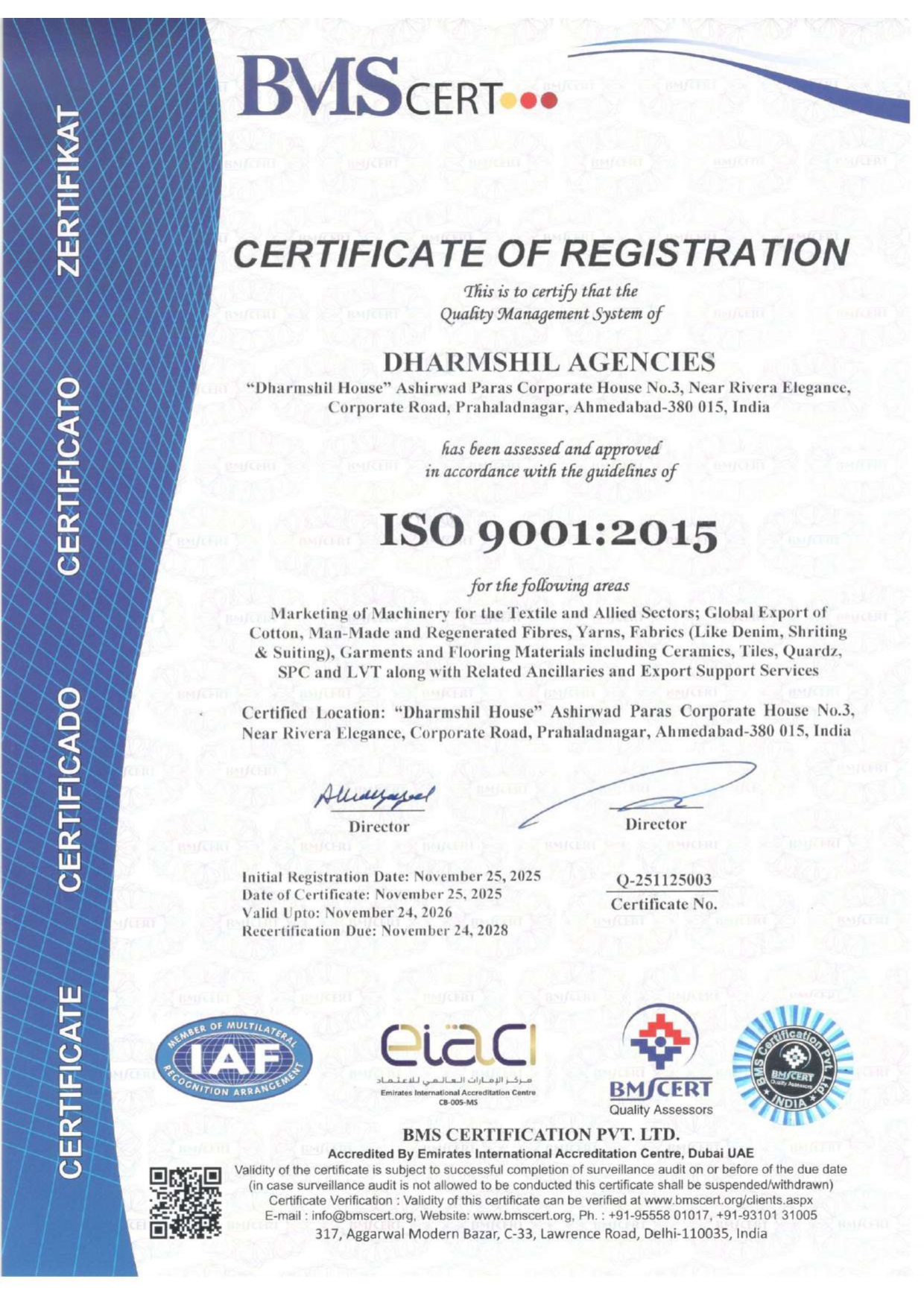 Dharmshil Group has been a trusted name in the industry since its inception in 1988. With nearly four decades of expertise, we have proudly represented renowned national and international manufacturers in Textiles and Allied Industries. Our diverse portfolio extends across Cotton, Man made & Regenerated fibres & Yarns, Fabrics, Garments, Dyes & Chemicals, Agro Products, Pharmaceutical, FMCG & Floorings ( Ceramics / Tiles / Quartz / SPC / LVT ) & ancillaries.