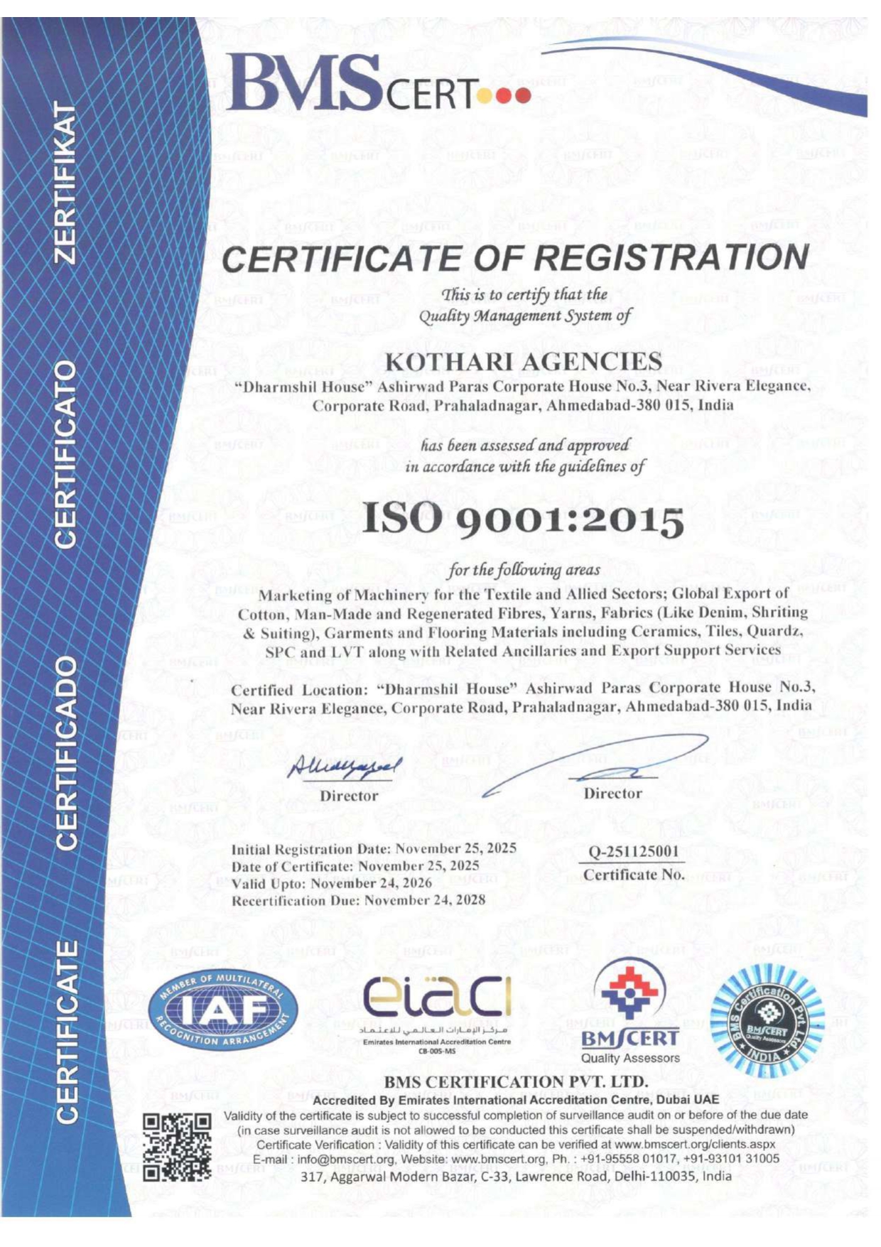 To achieve maximum customer satisfaction by offering high-quality products and services while fostering innovation, strategic growth and partnerships in key industries like Textiles, Defense, Pharma, FMCG, Real Estate & Flooring sectors. We aim to strengthen our contributions to the Nation by aligning with the Aatma-Nirbhar Bharat initiative.